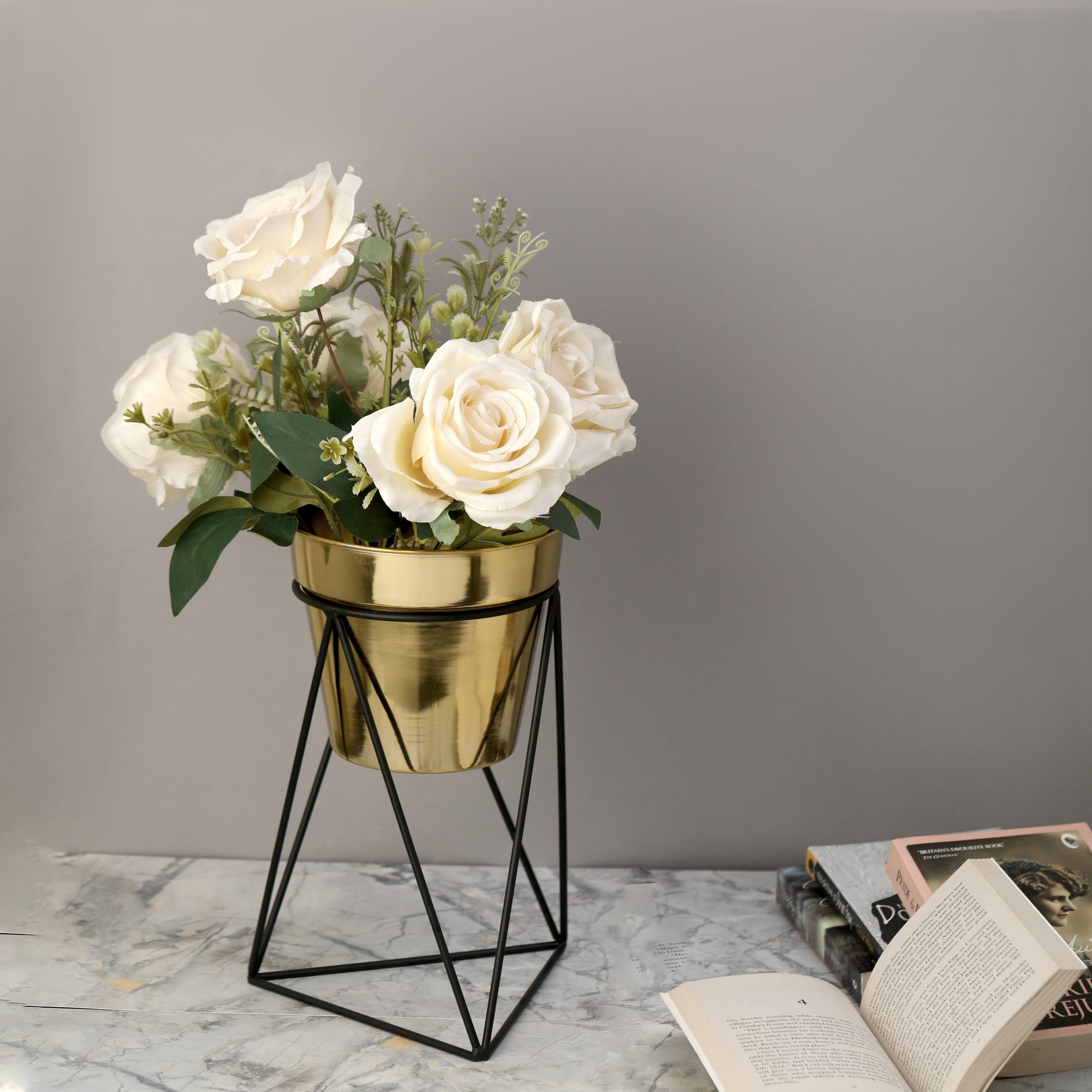 Bring a touch of modern elegance to your space with the Triad Pot Stand. This stunning planter features a smooth, golden pot that instantly adds warmth and sophistication. It is perfectly complemented by a minimalist black metal stand crafted in a distinctive triangular formation—three triangles interlocked, with one acting as the sturdy base.