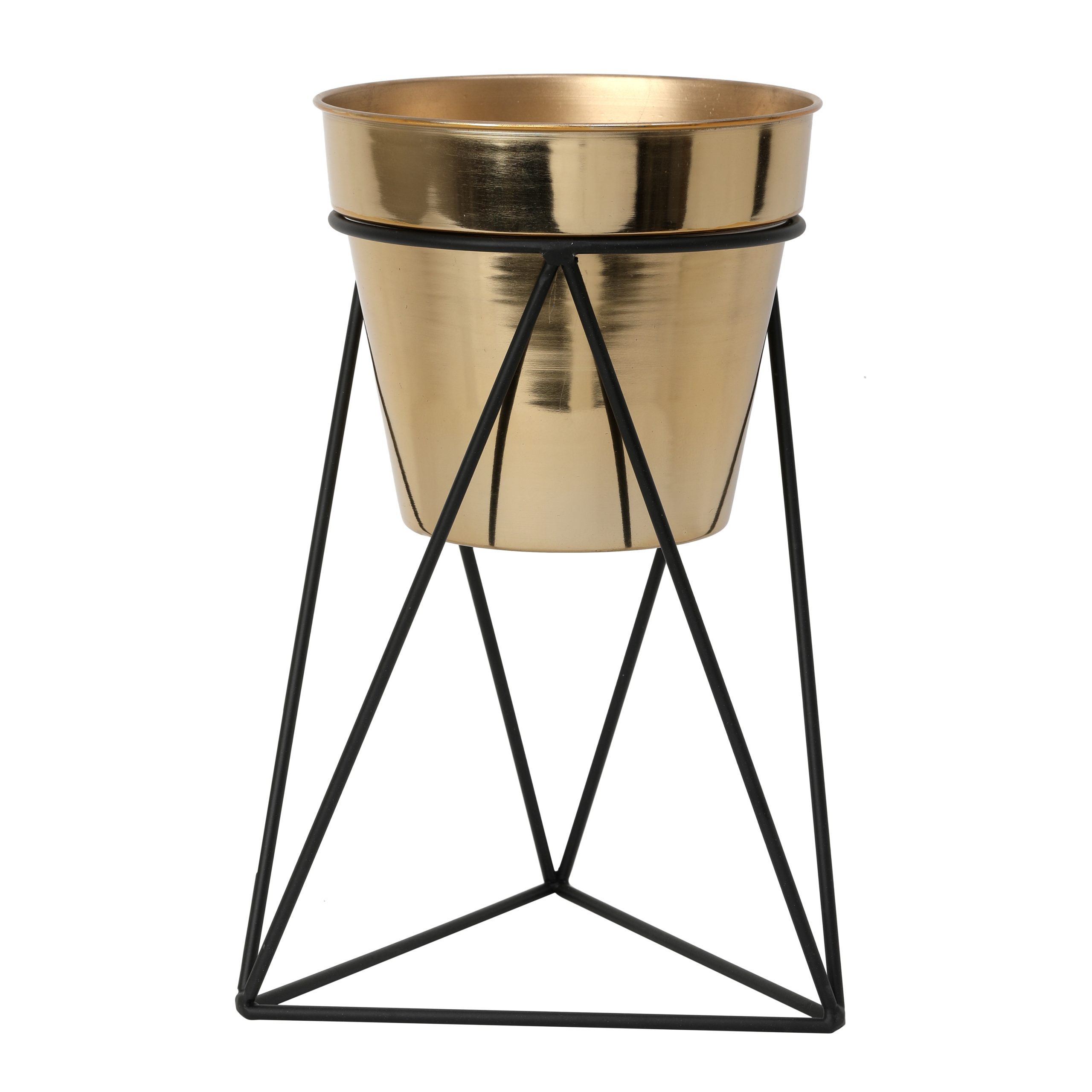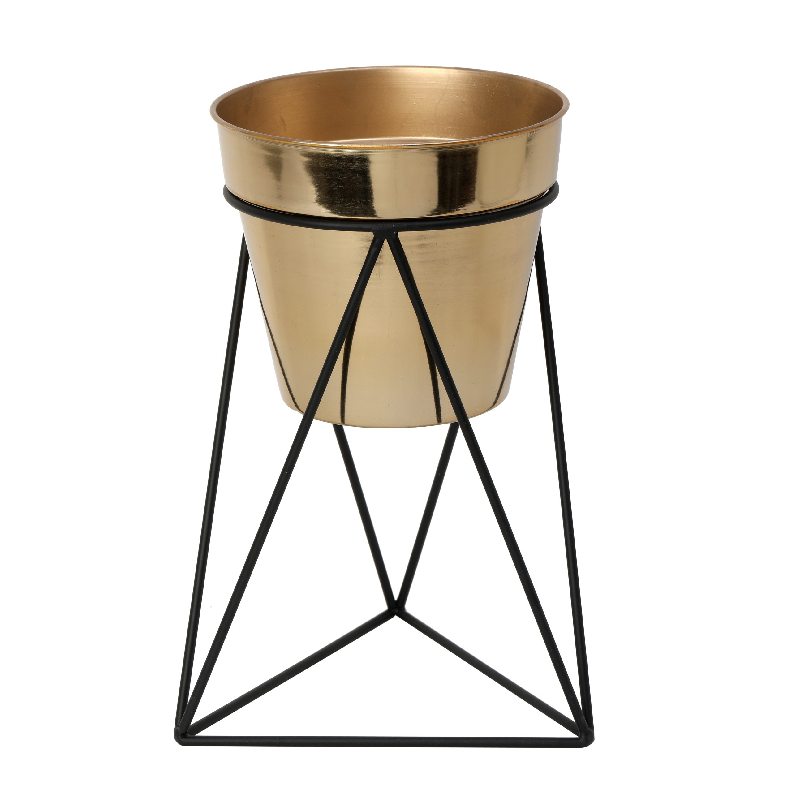 Elevate your plants in style with the Triad Pot Stand, featuring a smooth gold pot paired with a sleek black metal stand. Its unique triangular structure adds a modern, artistic touch to any home décor.